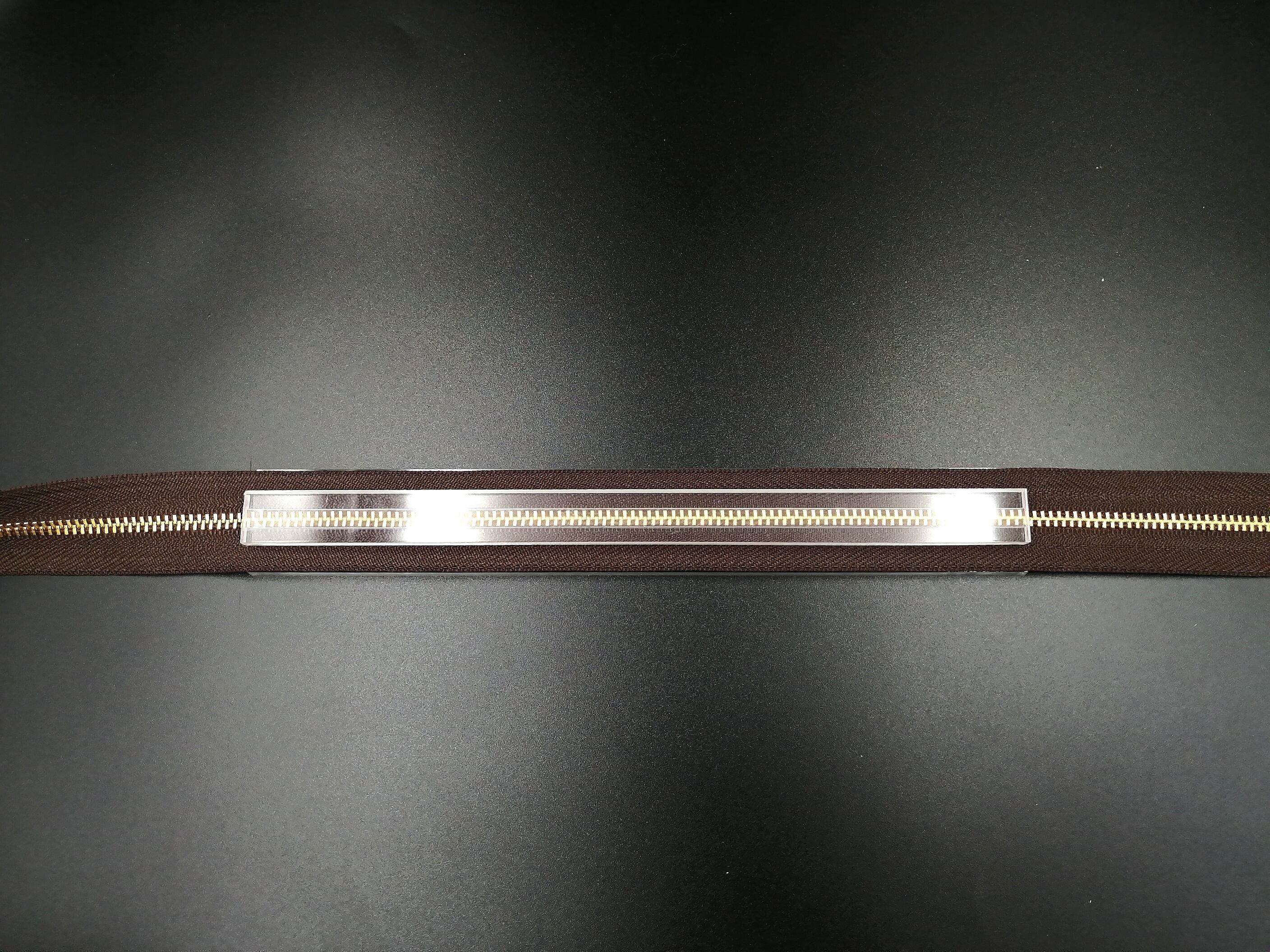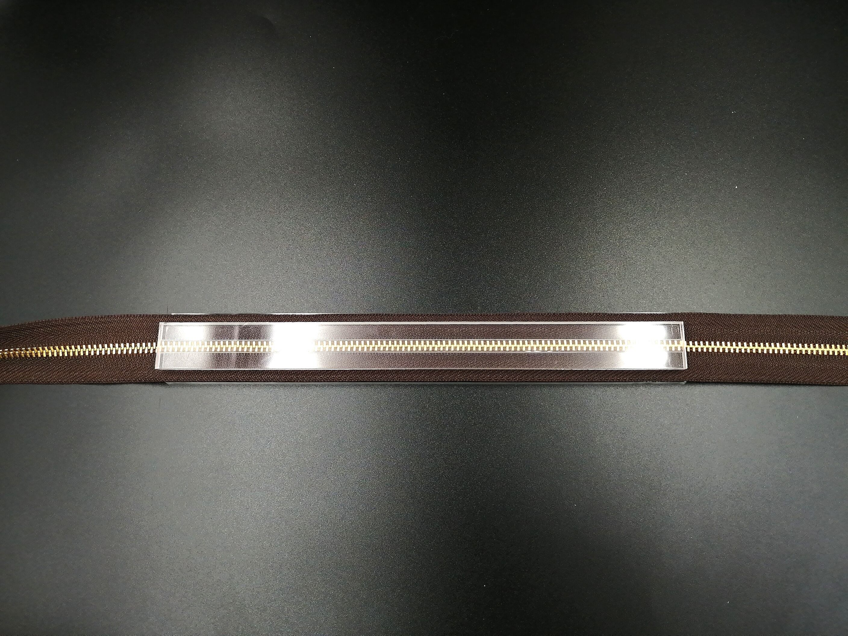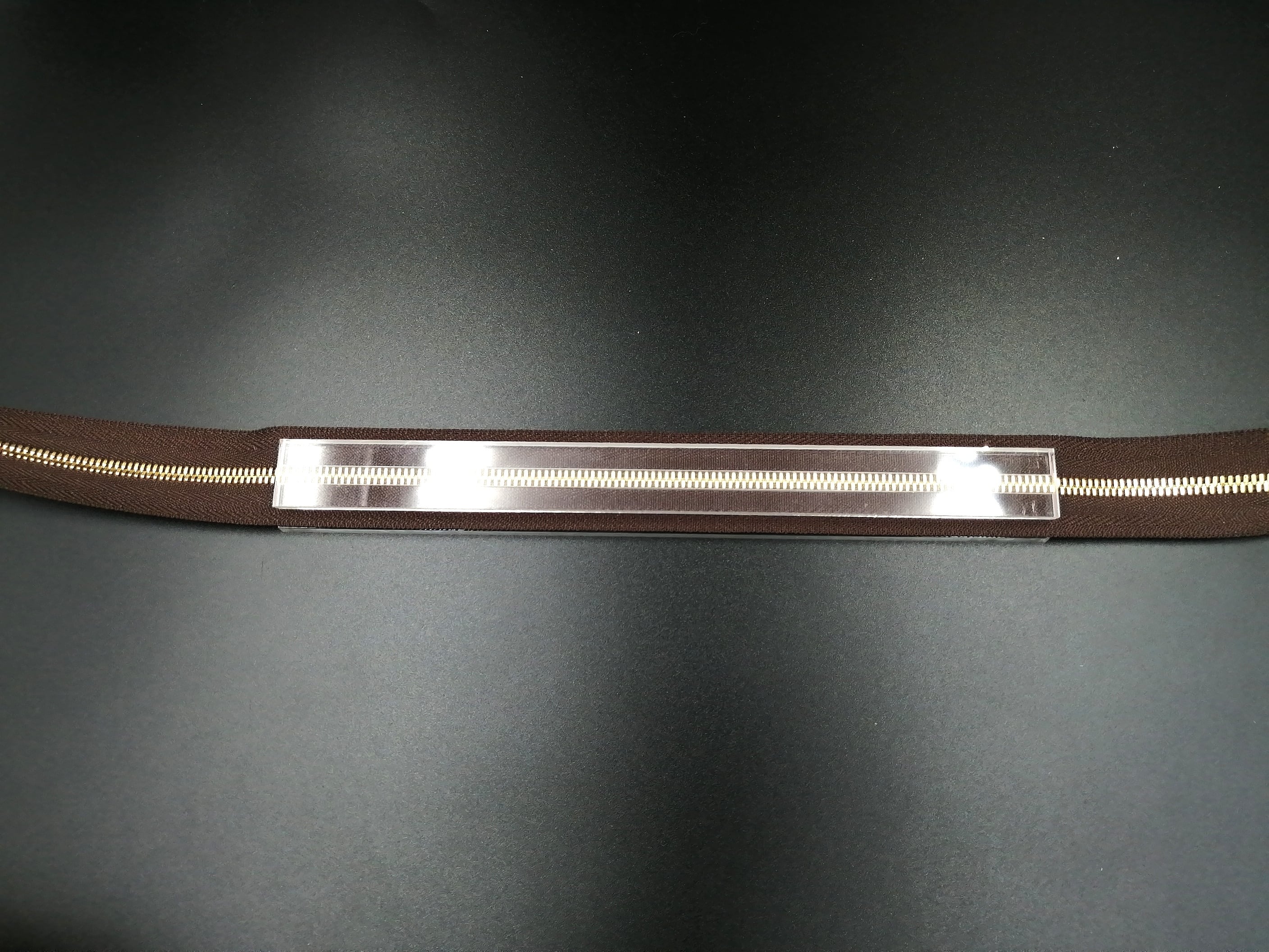 ファスナーへののり付けを綺麗に行えるアクリル製の治具。