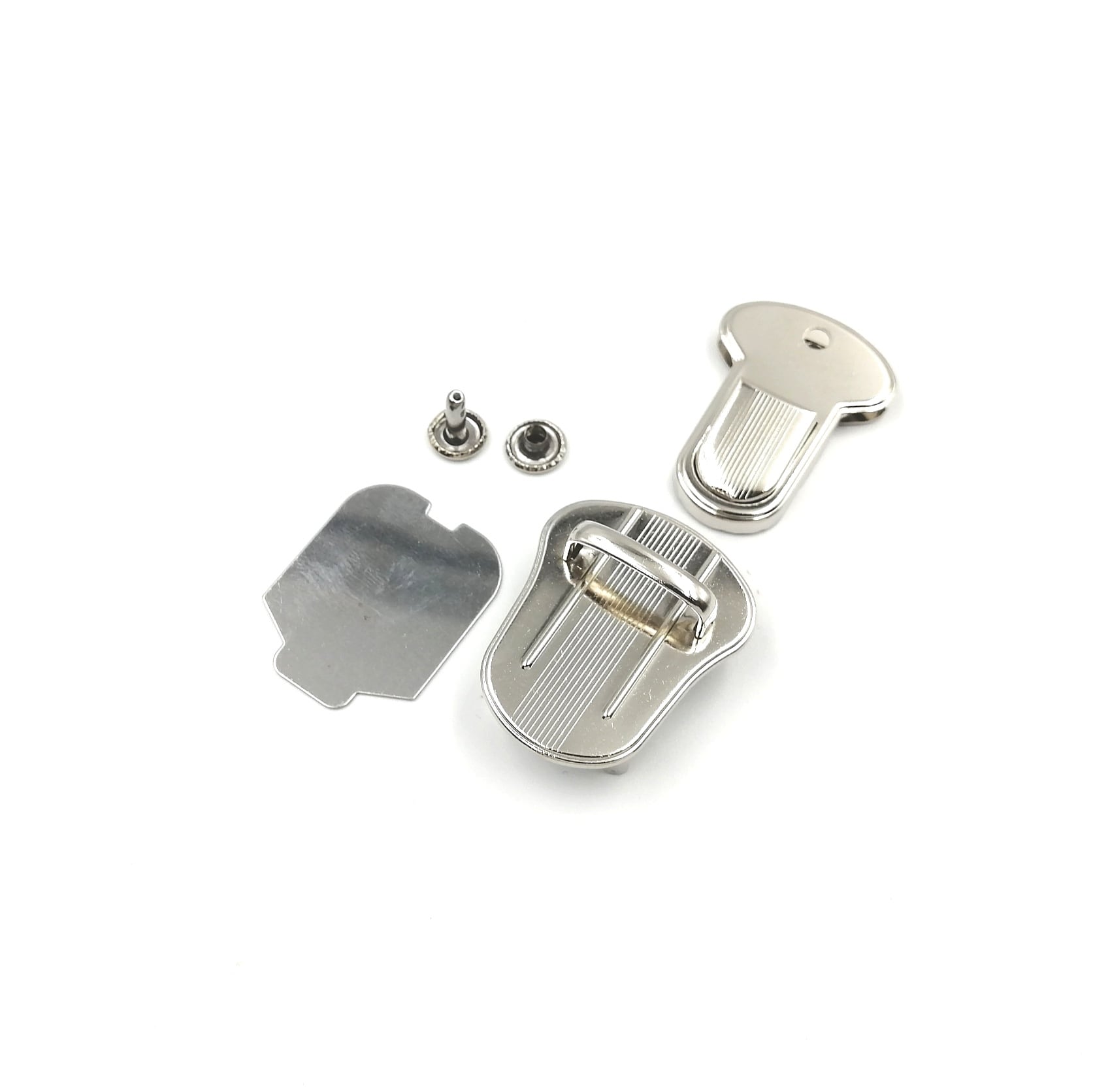 レトロな雰囲気がかわいい差し込み金具です。最もよく使われるのは、ショルダーバッグのフタ部分。誰もが一度は見たことのある金具だと思います。アイデア次第で、いろんな用途もありそうです。取り付け方法は、土台部分が割足、差し込み部分がカシメとなっています。カシメが付属されているので、そちらをお使いください。この他に、小(ニッケル、ゴールド、アンティック)、中(ニッケル、ゴールド、アンティック)、大(ゴールド、アンティック)がございます。