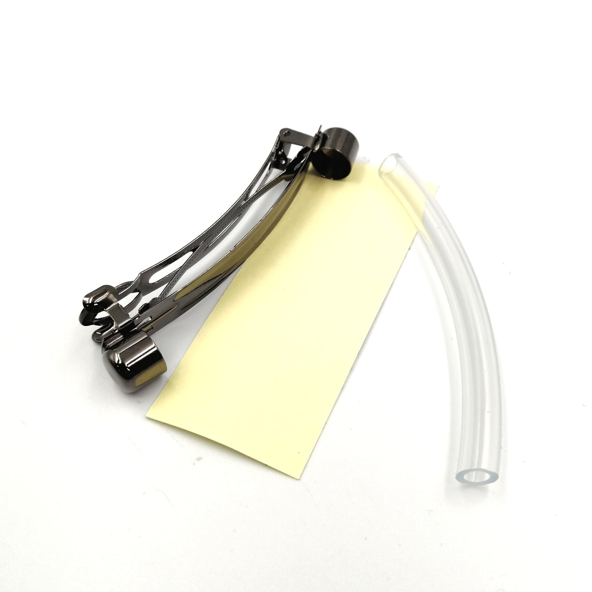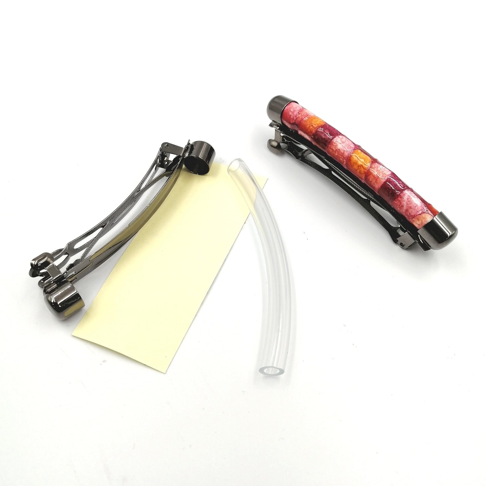 バレッタは髪留めの一種で、様々なタイプやデザインがあり髪を留めた際のワンポイントになります。革はお好みの物や、端革をご利用ください。(革はセットに含まれません。)
